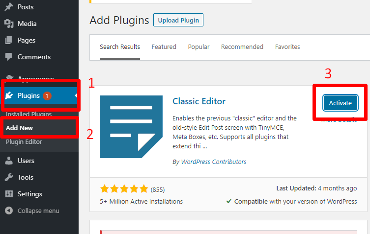 Installing Classic Editor Plugin